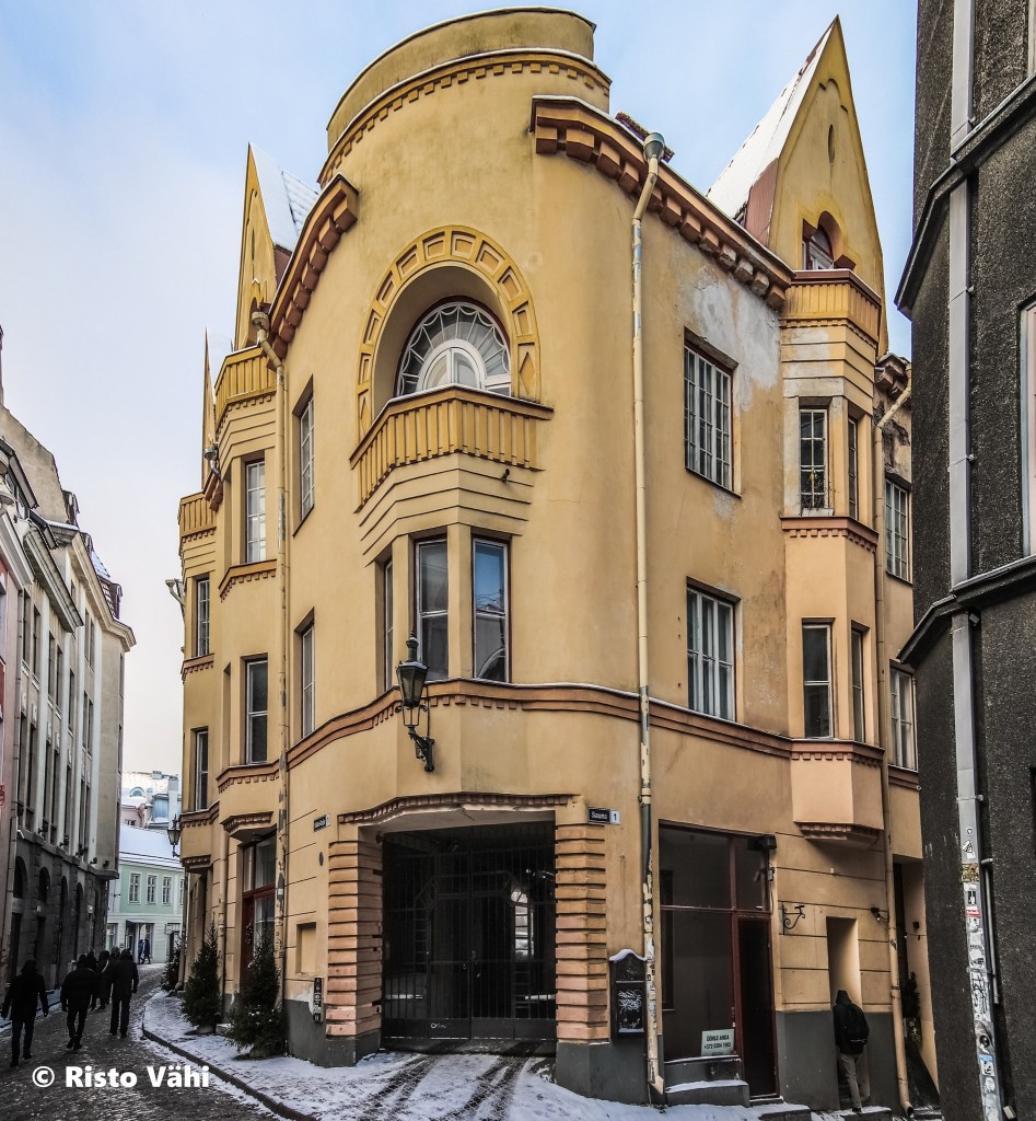 Väike-Karja ja Sauna tänavate nurgal asuv elamu on Karl Burmani ja Artur Perna büroo ühistöö, mis valmis 1914. aastal. Kuigi linnaehituslikult on veider, et esindusliku tänavanurga alumise osa võtab enda alla kangialune, on selle asja taga ka oma lugu.